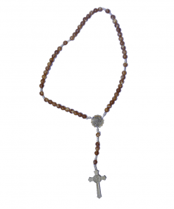Terço de madeira na cor pau brasil com nós.