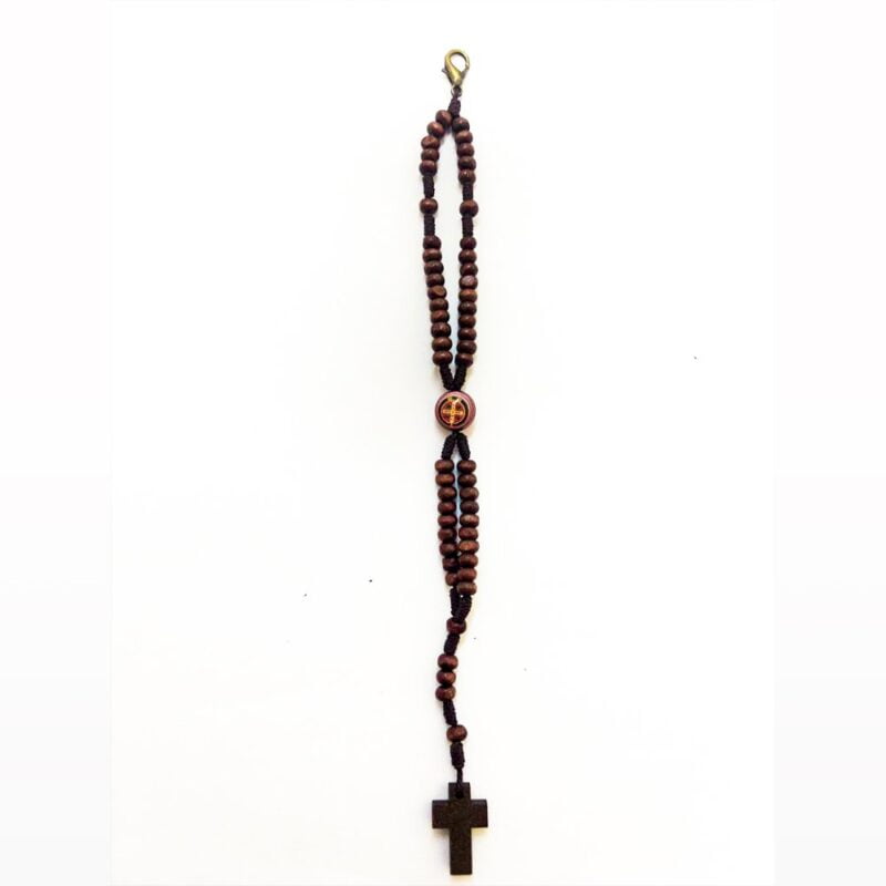Terço de pulso com contas e medalha em madeira na cor marrom escuro.